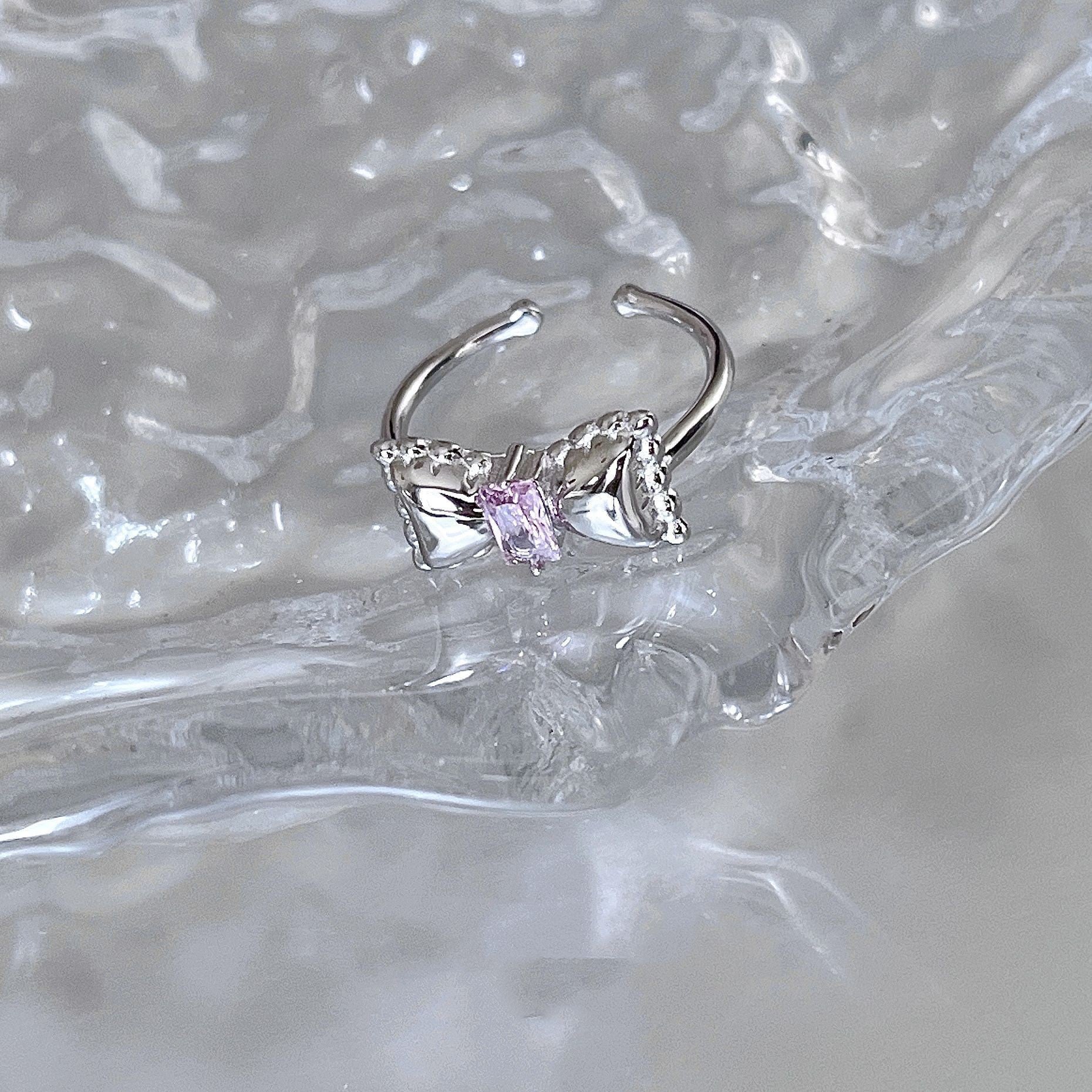 This elegant Zircon crystal Opening Ring with bow -J2723S showcases a unique texture of starry patterns, exuding a sense of sophistication and style. Crafted with precision, this ring offers a touch of celestial beauty, perfect for any occasion. Elevate your look with this stunning piece.