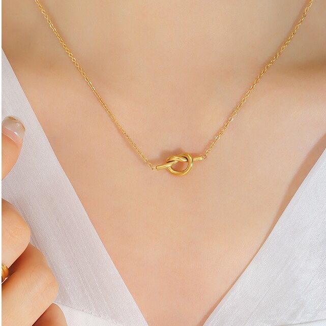 This 18K gold-plated pendant features a stylish titanium steel knot design for a durable and long-lasting quality. The pendant hangs from a 40+5CM collarbone chain, a length that fits most necklines. This stunning pendant adds a touch of style and elegance to any outfit.