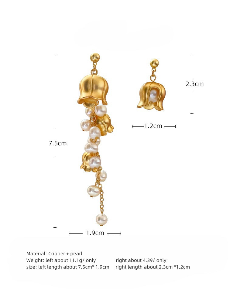 This French vintage matte lily of the Valley freshwater pearl earrings, each petal detailed outline, as if out of the painting, with warm pearls, asymmetrical design to highlight the unique personality. 925 silver needle, protect sensitive skin, long swaying posture, full of advanced sense.