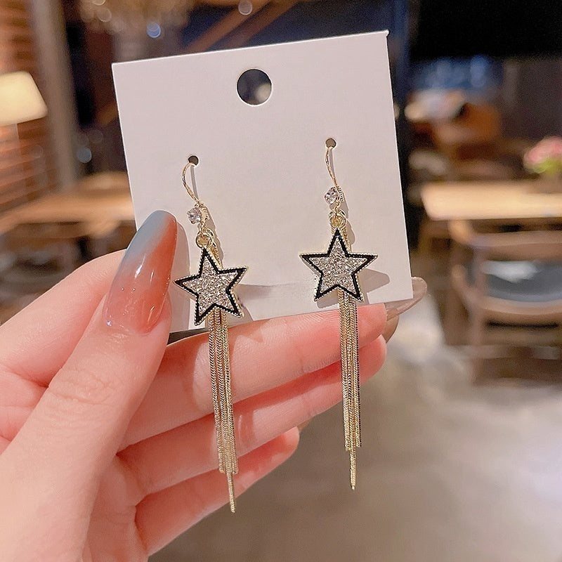 Introducing our S925 Silver Needle Black Five Star Fringe Earrings, the perfect accessory for a touch of elegance. The long tassels add a chic flair, while the S925 silver needle ensures durability and quality. Upgrade your look with these versatile and trendy earrings, a must-have for any fashion-forward individual.