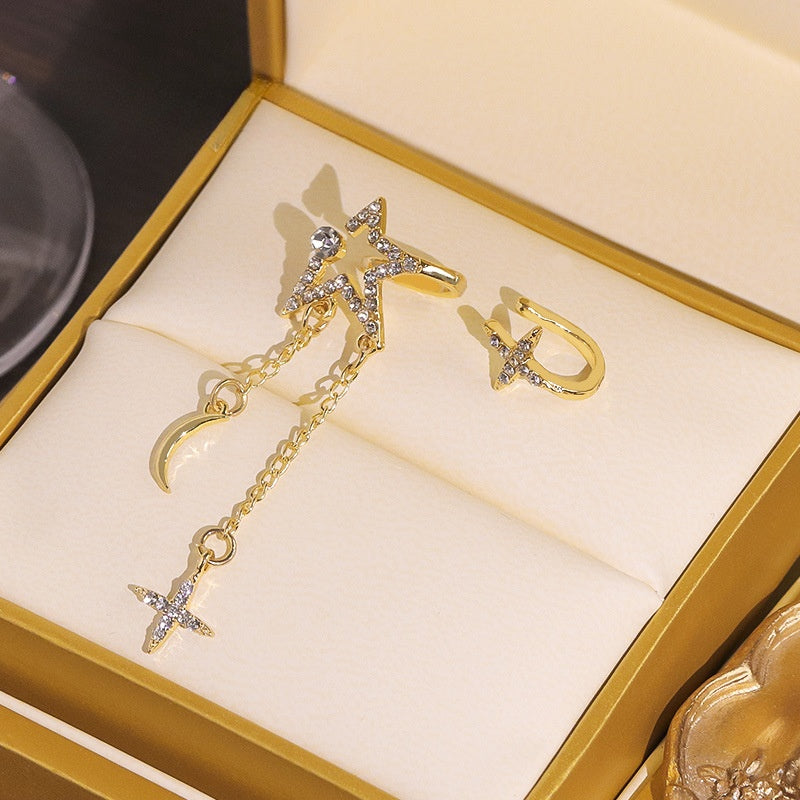 Dazzling stars and moon design, perfect for non-pierced ears, gives a unique, chic style. Elevate your look with this exclusive, fashion-forward piece.
