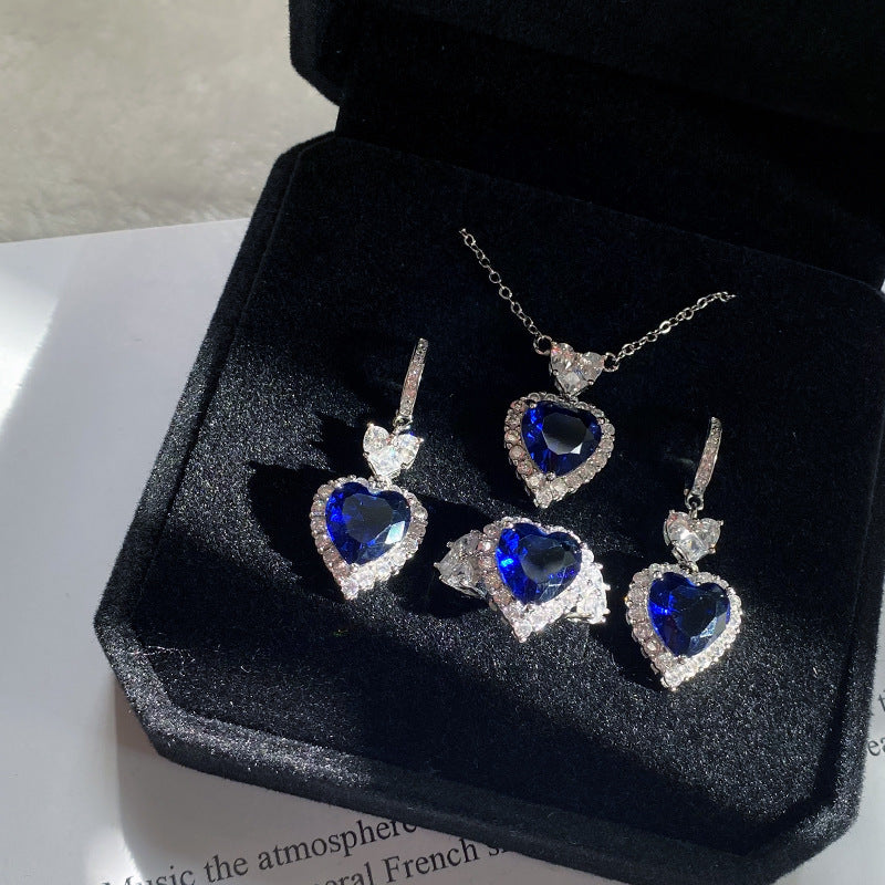 The heart is studded with diamond earrings, colorful rings and pendants, each in a heart-tinged blue tone, like a mysterious jewel in the deep sea. Whether it's an everyday outfit or a special occasion, this set of jewelry is the perfect way to enhance your look. Come and enjoy the elegance of the deep sea