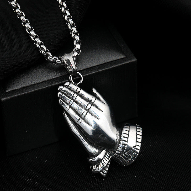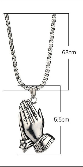 Add a touch of luck to your personal style with our Hipster Prayer Hand Lucky Necklace for men and women. This necklace features a trendy design of two hands clasped in prayer, made from durable titanium steel and finished with a stylish sweater chain. Stay fashionable and blessed with this unique accessory.