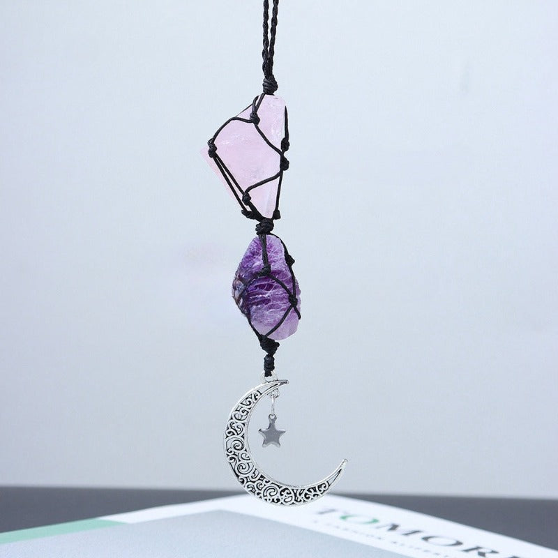 Enhance your car's aura with our premium natural amethyst energy raw stone star moon car pendant. Hand-crafted with colorful weaving, this pendant not only adds a touch of elegance, but also channels positive energy through its raw stone, giving you a luxurious and exclusive driving experience.