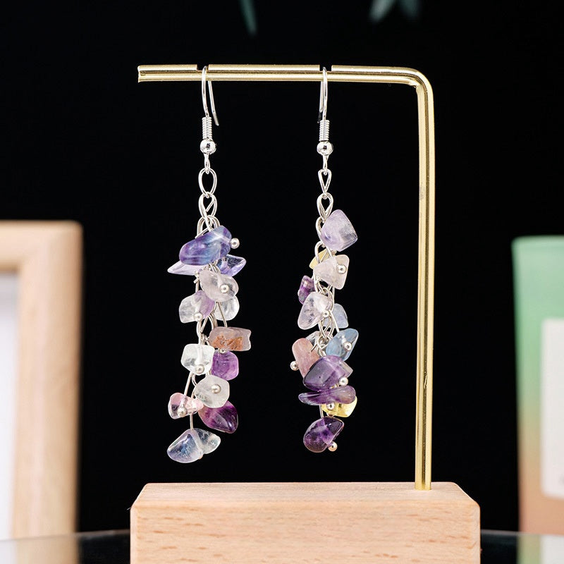 Elevate your style with our Natural Crystal Colorful Fluorite Gravel Earrings. Crafted from genuine multi-colored crystals, each piece of this handcrafted jewelry is a unique work of art. Experience the enchanting energy of nature with these beautiful and exclusive earrings. Perfect for the sophisticated and refined woman who appreciates the beauty of natural elements.