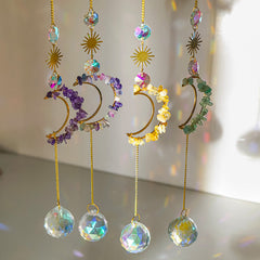 Elevate your outdoor space with the Natural Aventurine Quartz primitive stone moon solar wind chimes. Crafted from rare Aventurine Quartz, these wind chimes add a touch of sophistication and exclusivity to your home. Let the gentle sound of the chimes and the natural beauty of the stone transport you to a world of luxury and elegance.