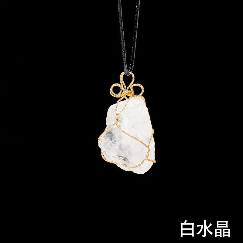 Indulge in the natural beauty of our white crystal raw stone necklace. Handcrafted with a delicate golden chain and a leather rope, this necklace exudes sophistication and elegance. Its unique design, featuring a woven net pendant, makes it a perfect statement piece for any occasion. Elevate your style with this luxurious hanging ornament.