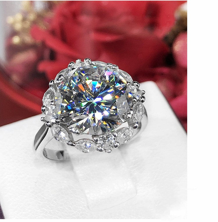 Introducing our 5 carat high clarity fire color Mosan diamond ring, This stunning ring features a popular pigeon egg style design and showcases a 5 carat imitation Mosan diamond with high carbon accents. Elevate your style with this luxurious and exclusive piece.