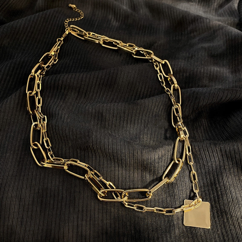 Elevate your style with our Light Luxury European and American Metal Double Necklace. This fashionable statement piece exudes a hip and edgy vibe, perfect for a night out or to showcase your personal style. With its unique design and high-quality materials, this necklace will add a touch of luxury and sophistication to any outfit.