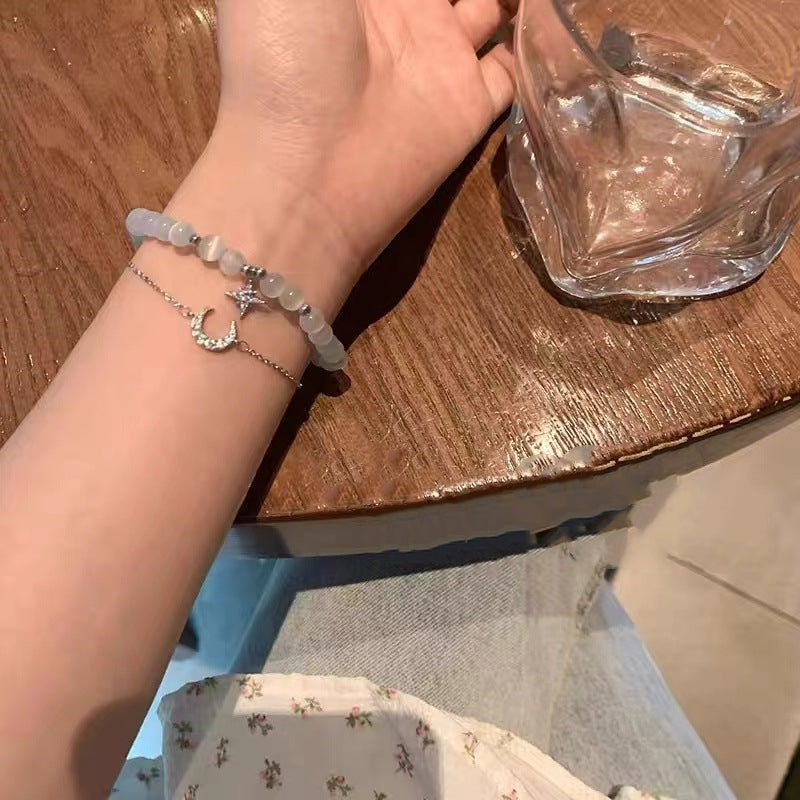 This Simple fashion star moon cat's eye double chain overlapping bracelet is the perfect addition to any outfit. The overlapping chain design creates a unique and stylish look, while the cat's eye stones add a touch of elegance. You'll love how this bracelet effortlessly elevates any look with its simple yet fashionable design.